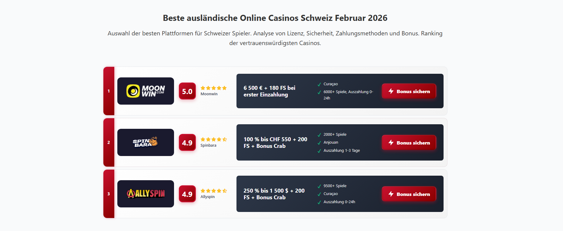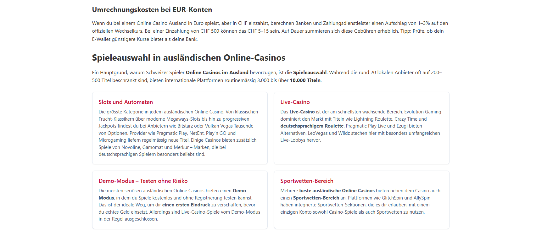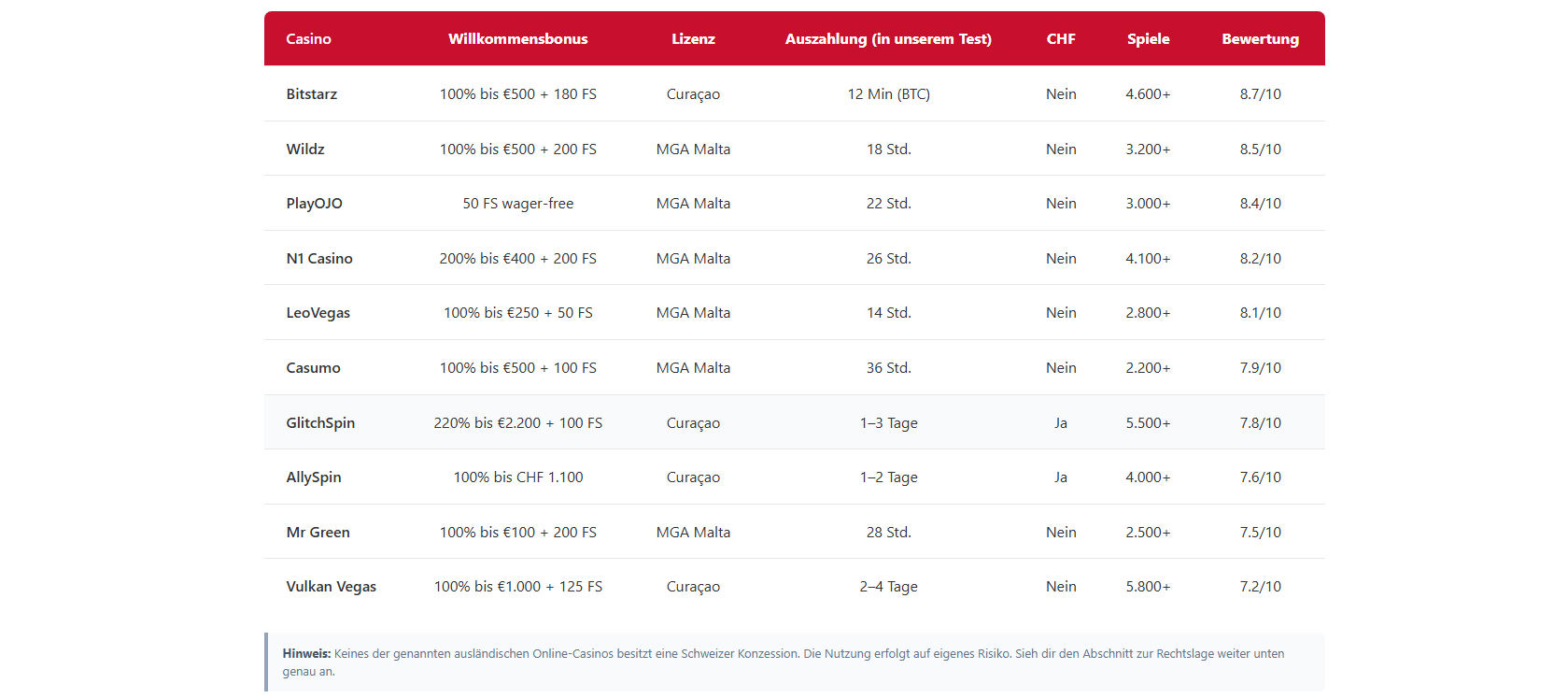 Kann ich in Schweizer Franken spielen?Die meisten ausländischen Online-Casinos bieten Schweizer Franken nicht als Kontowährung an. Du spielst in der Regel in Euro oder Kryptowährungen. Bei der Umrechnung fallen Gebühren von 1–3% an. Einige Curaçao-lizenzierte Anbieter wie AllySpin und GlitchSpin bieten CHF als Option.