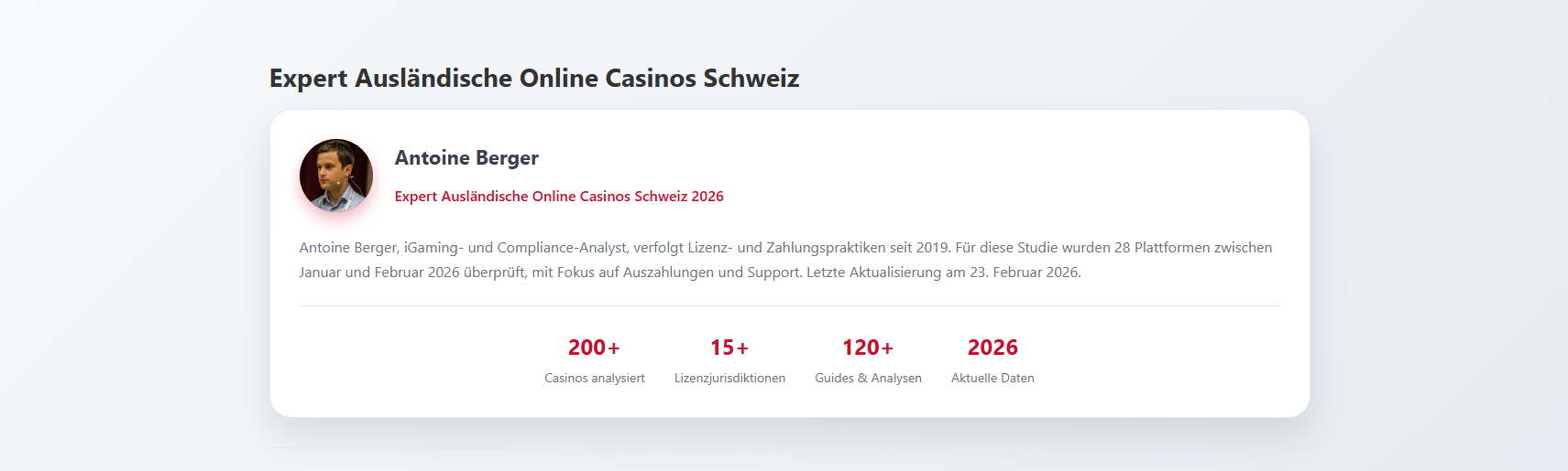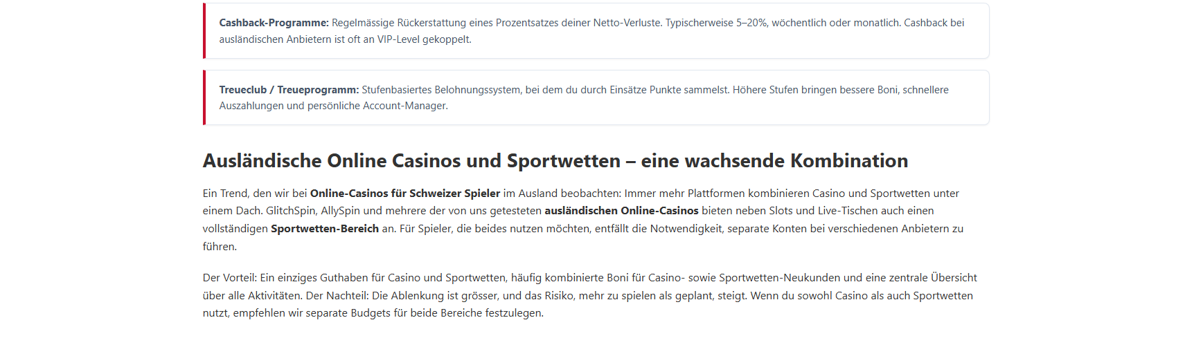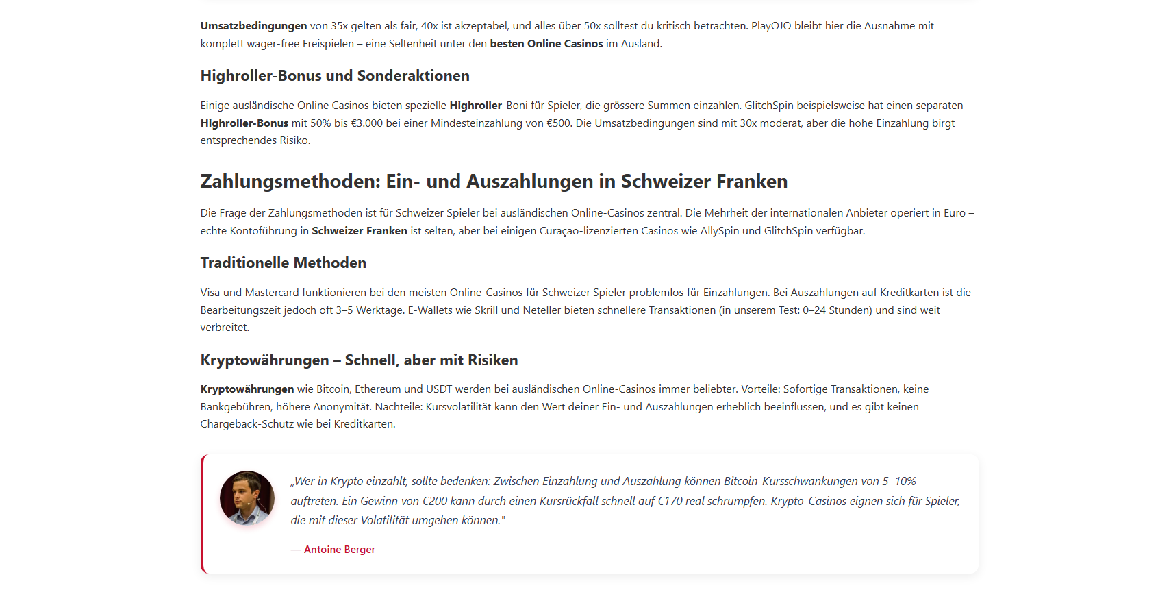 Kann ich in Schweizer Franken spielen?Die meisten ausländischen Online-Casinos bieten Schweizer Franken nicht als Kontowährung an. Du spielst in der Regel in Euro oder Kryptowährungen. Bei der Umrechnung fallen Gebühren von 1–3% an. Einige Curaçao-lizenzierte Anbieter wie AllySpin und GlitchSpin bieten CHF als Option.