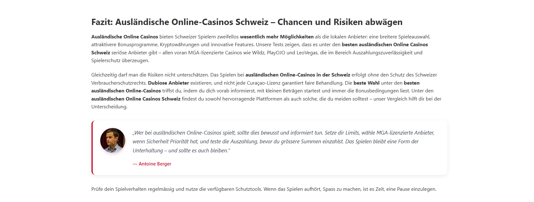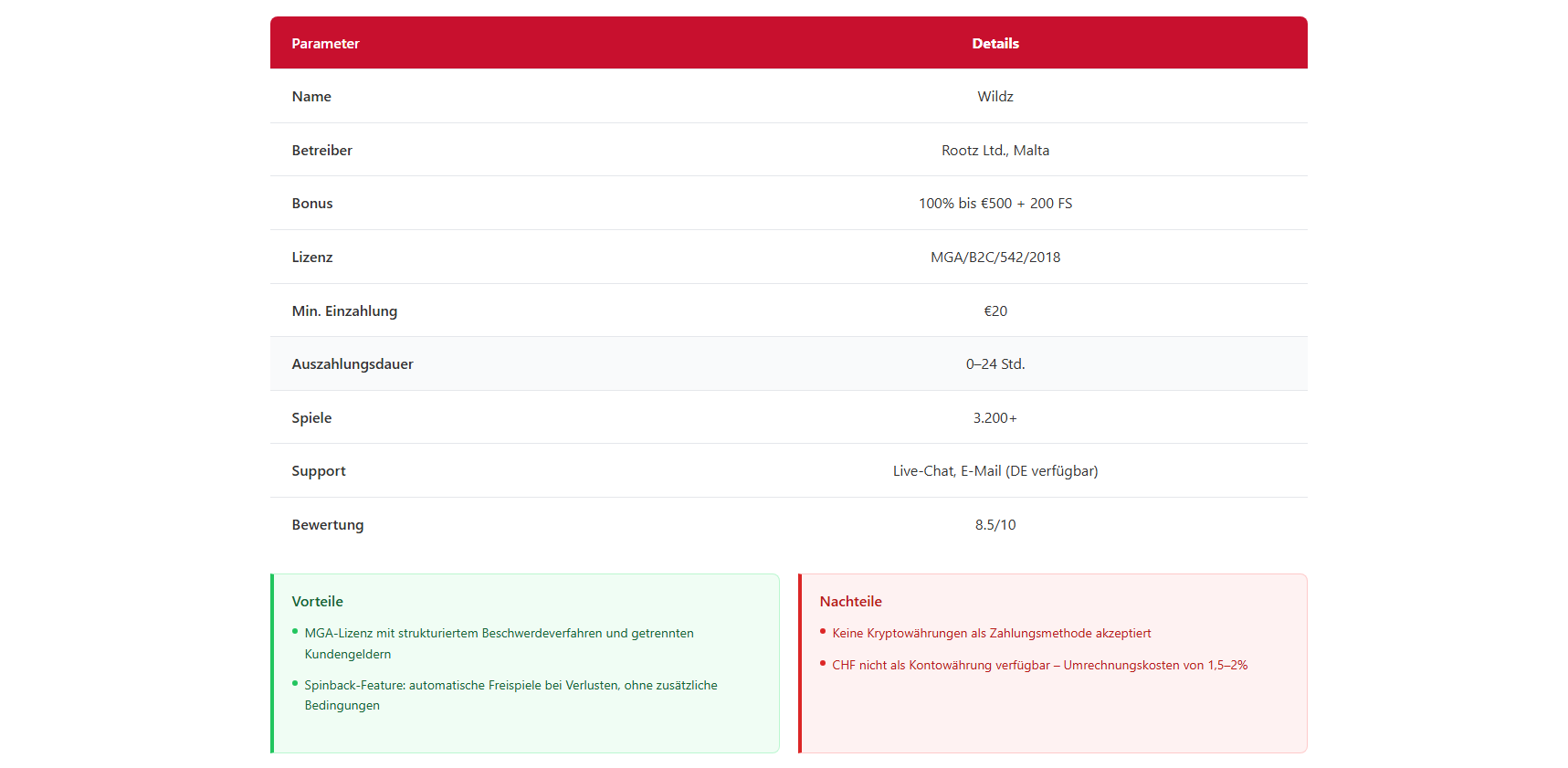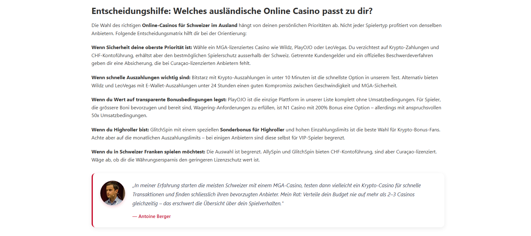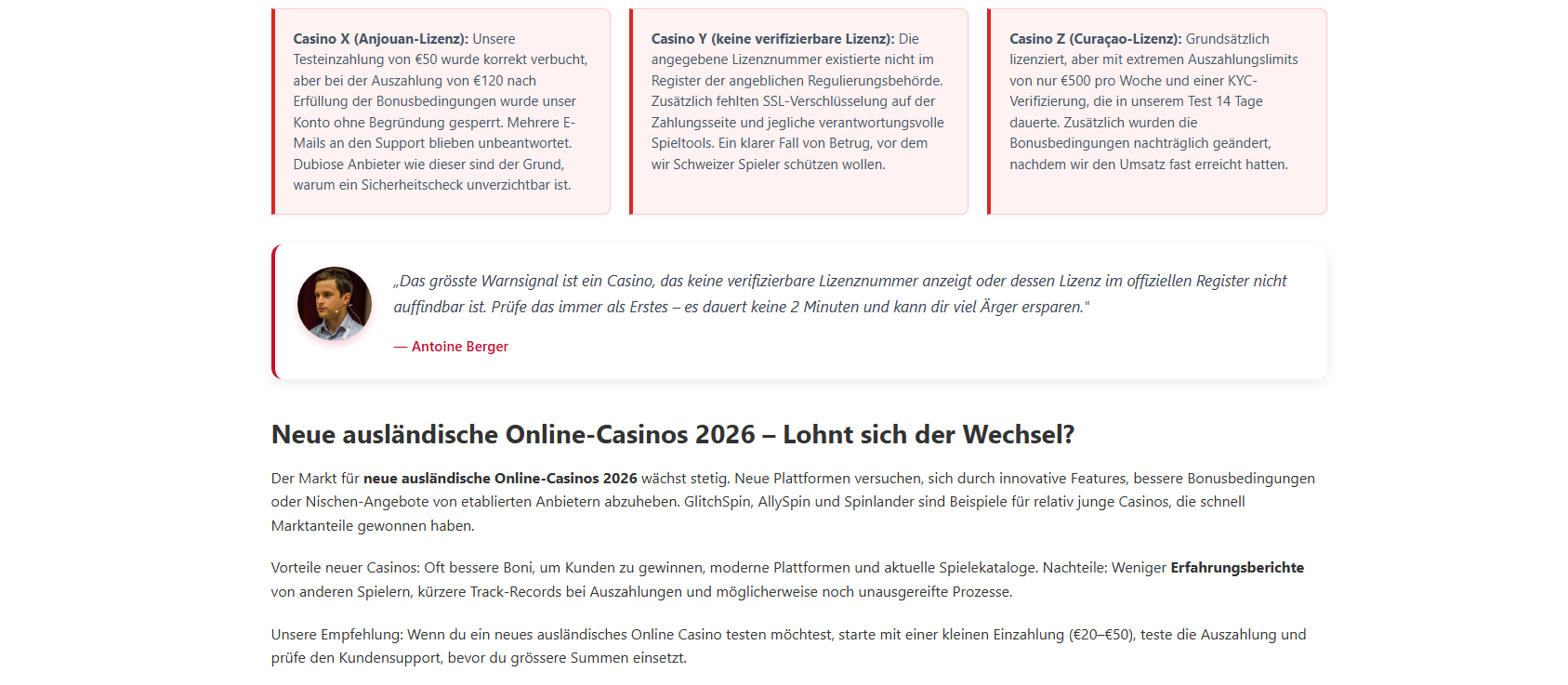 Welche Lizenz ist für Schweizer Spieler am sichersten?Die MGA-Lizenz (Malta Gaming Authority) bietet den besten Schutz in Europa: getrennte Kundengelder, regelmässige Audits und ein offizielles Beschwerdeverfahren. Die Curaçao-Lizenz ist verbreitet, aber weniger streng reguliert. Anjouan- und Costa-Rica-Lizenzen solltest du meiden.